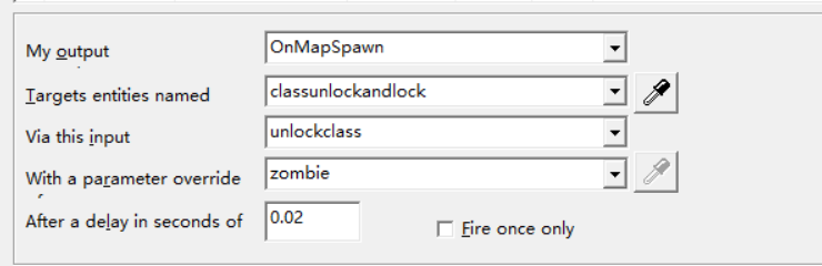此图意思为 地图初始化0.02秒后 触发logic_classunlock进行解锁zombie class操作 此处zombie可换成其他种类的僵尸 如要解锁多个请自行设置多个触发