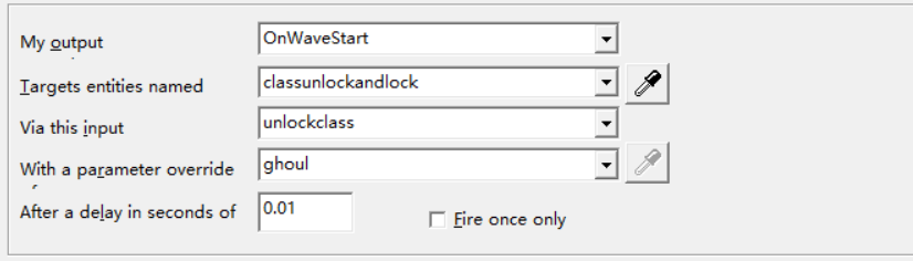 此图片设置意思为 第二波开始后0.01秒 触发logic_classunlock 进行解锁class操作 解锁ghoul僵尸 回合结束意思差不多 视情况可自行设置